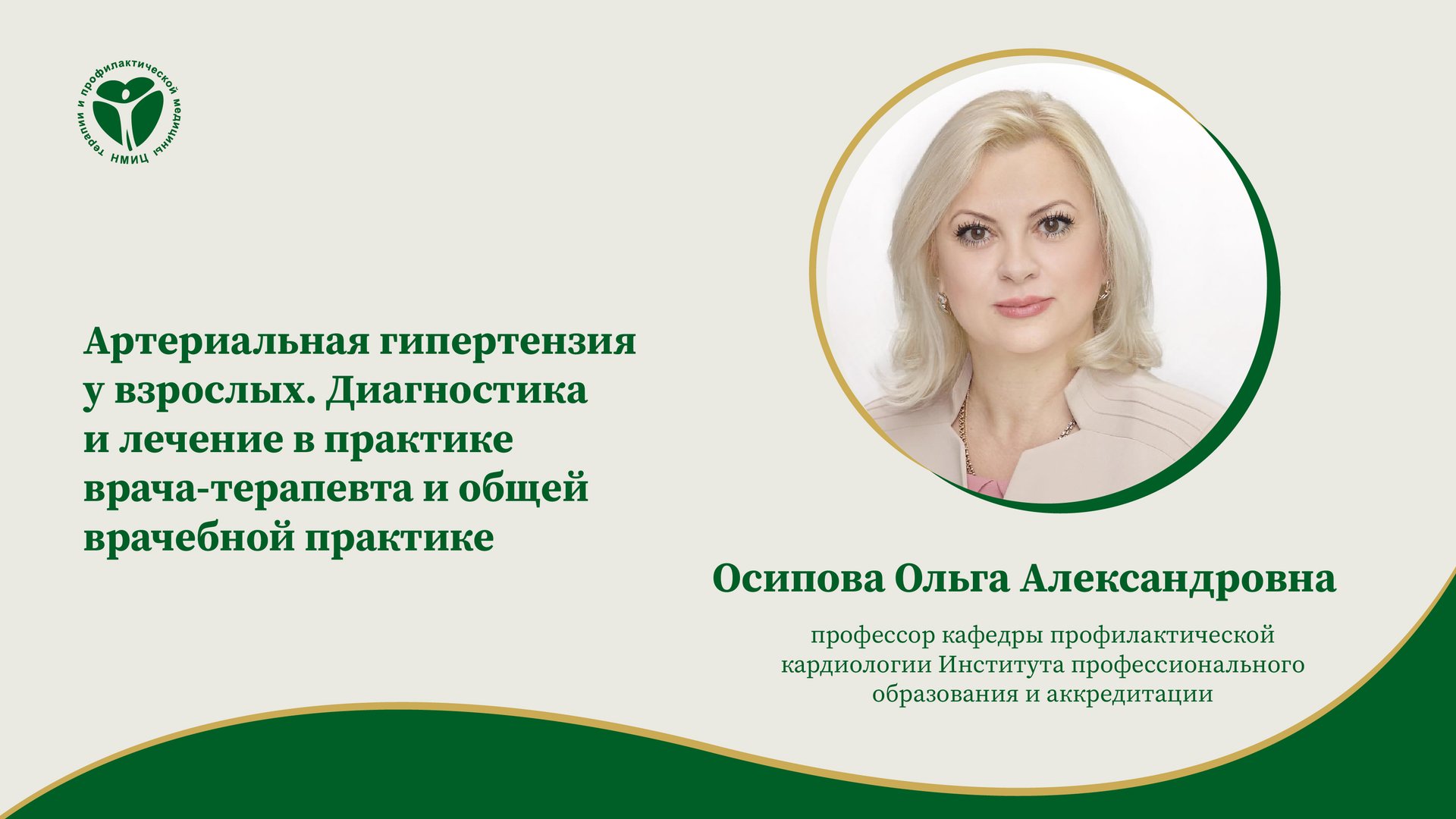 «Артериальная гипертензия у взрослых. Диагностика и лечение в практике врача-терапевта и общей врачебной практике», лекция от 15.02.2024. Лектор: Осипова Ольга Александровна — д.м.н., ведущий научный сотрудник отдела научно-стратегического развития первичной медико-санитарной помощи, профессор кафедры профилактической кардиологии института профессионального образования и аккредитации ФГБУ «НМИЦ ТПМ» Минздрава России.