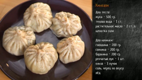 Как приготовить хинкали: Для теста: мука - 500 гр. теплая вода - 1 ст. растительное масло - 2 ст. л. щепотка соли Для начинки: говядина - 200 гр. баранина - 200 гр. репчатый лук - 1 шт. кинза - 1 пучок соль, перец по вкусу лед Соус сацебели: гранатовый сок - 50 гр. грецкие орехи - 30 гр. куриный бульон - 150 гр. половинка луковицы чеснок - 2 зубчика мята - 30 гр. кинза - 3- гр. паприка - 1 ч. л. хмели-сунели - 1 ч. л.
