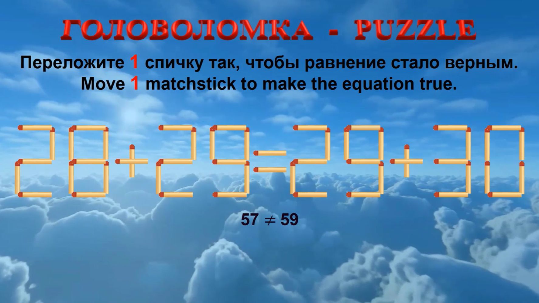 ГОЛОВОЛОМКА – PUZZLE. Спичка. 28+29≠29+30, 30+25≠26+35, 32+32≠38+29, 34+36≠33+35