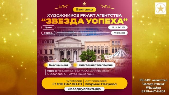 2 ЧАСТЬ - мы стали ФИНАЛИСТАМИ Международного Телевизионного Конкурса "Города России"-2025! И приняли участие в финальном концерте, который прошел в Москве, 17 ноября 2025 г, в Концертном зале "Москва". 14 наших художников из разных городов страны представили свои работы широкой публике. Все были награждены Почетными дипломами финалиста и Благодарностями за участие в конкурсе 2025 года. Так же все участники получили памятную именную награду из рук организаторов и 1 ТВ канала России. Мы начинаем подготовку к большой Всероссийской Премии, которая пройдет весной 2026 года! ********* Марина Петрова - арт продюсер, наставник, художник Звездауспеха.рф vk.com/zvezdayspehaart
