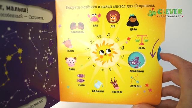 CLEVER-зодиаки: 12 интерактивных книг о каждом знаке для малышей от 0 до 3 лет. - Сильные стороны и черты характера для каждого знака. - Подвижное колесико на каждой страничке: крутите его, чтобы найти ответы на вопросы! - Занимательные факты о звездах для вашего малыша.