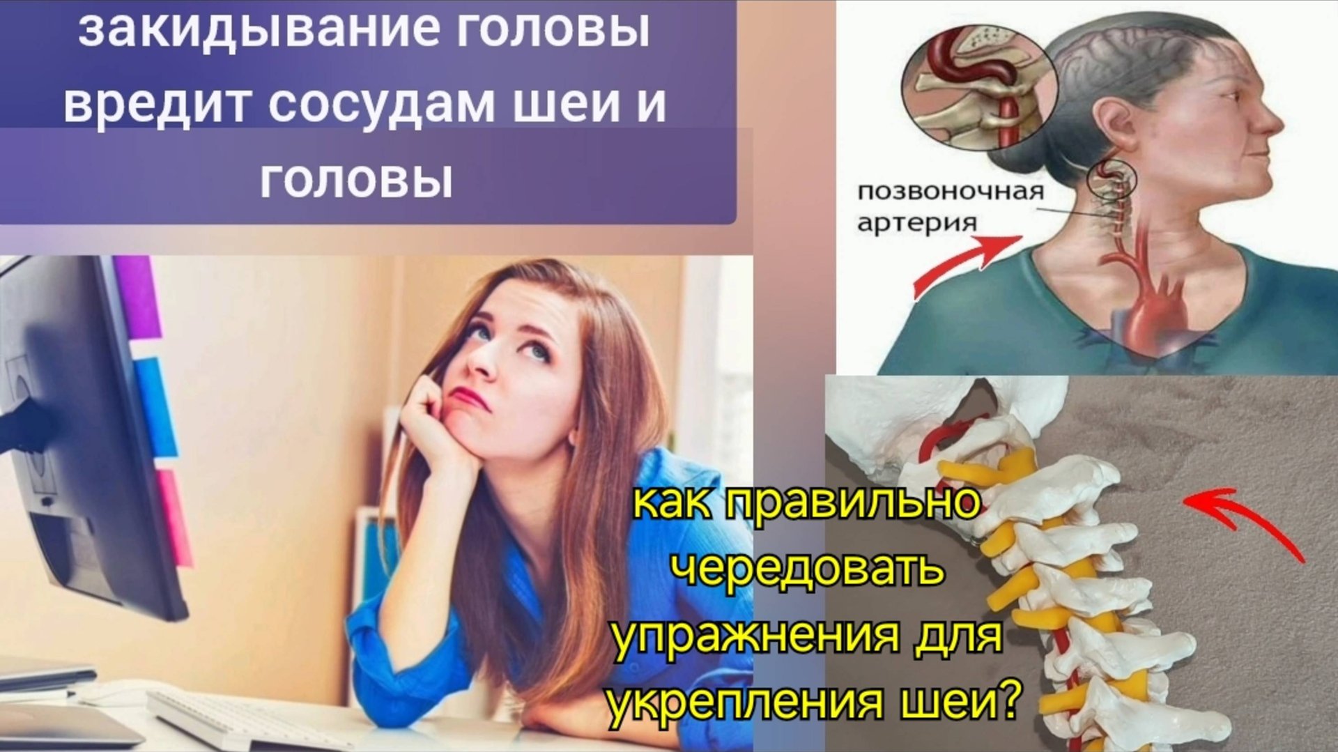 #шея #мозг #позвоночник #здоровье Закидывание головы вредит сосудам шеи и мозга, потому что зажатые подзатылочные мышцы давят на позвоночные артерии, ухудшают кровоснабжение мозга. Сдавливание нижних нервов шеи вызывает слабость и онемение рук. Как освободить сосуды и нервы шеи от сдавливания? Расслабляя подзатылочные мышцы, освобождаем от компрессии позвоночные артерии, через которые кровь течет в мозг. Для полноценного и стабильного укрепления здоровья, необходимо восстановить нормальную работу всех мышц шеи и грудного отдела позвоночника. заказать видеокурсы "Укрепление шейного отдела позвоночника", "Укрепление грудного отдела позвоночника": по электронной почте valeo2020valeo@yandex.ru или телеграм @registr1209 телеграм: t.me/registr1209