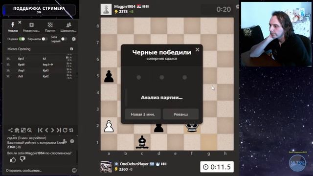 Друзья, всем привет. Продолжаю сражения дебютом Эльшада. Шахматы. Блиц 3+0. Если интересно, - подписывайтесь на канал, ставьте лайки, оставляйте комментарии. Поддержка донатом через: DonationAlerts: https://www.donationalerts.com/r/onedebutplayer Бусти: https://boosty.to/onedebutplayer/donate Donatepay: https://new.donatepay.ru/@1272445 Стрим на Boosty: https://boosty.to/onedebutplayer/streams/video_stream Стрим на Твитч: https://twitch.tv/onedebutplayer