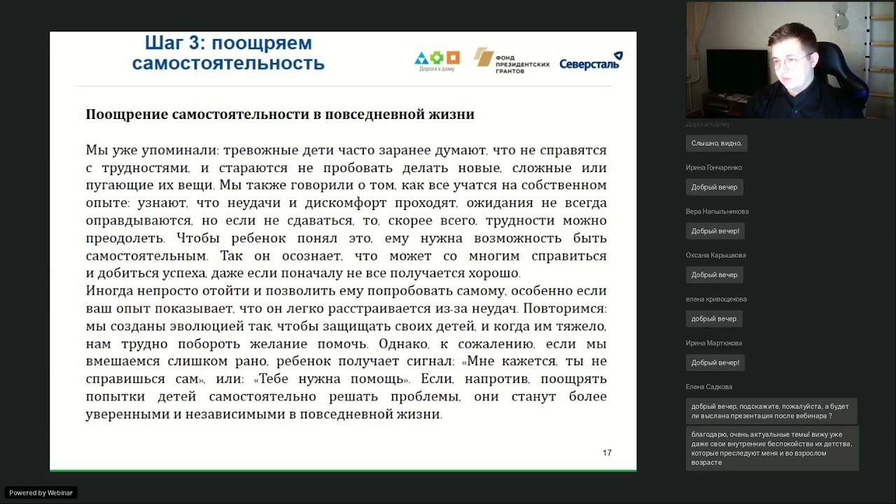 Онлайн-занятие для родителей. Ведущий — Морозов Вадим Александрович, психиатр БУЗ ВО «Вологодский областной психоневрологический диспансер № 1», проекта "Выбери жизнь БФ "Дорога к дому". Содержание: руководство для родителей: что менять; о программе самопомощи: пять шагов. Мероприятие состоялось в рамках проекта «Выбери жизнь» на средства компании «Северсталь» при поддержке Фонда президентских грантов.