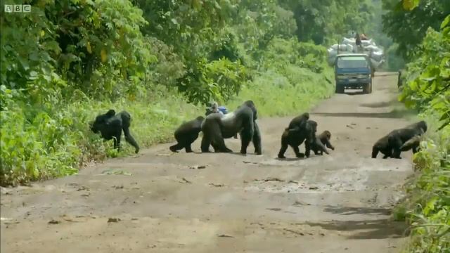 Огромная серебристая горилла блокирует дорогу, чтобы его семья могла безопасно пересечь ее.