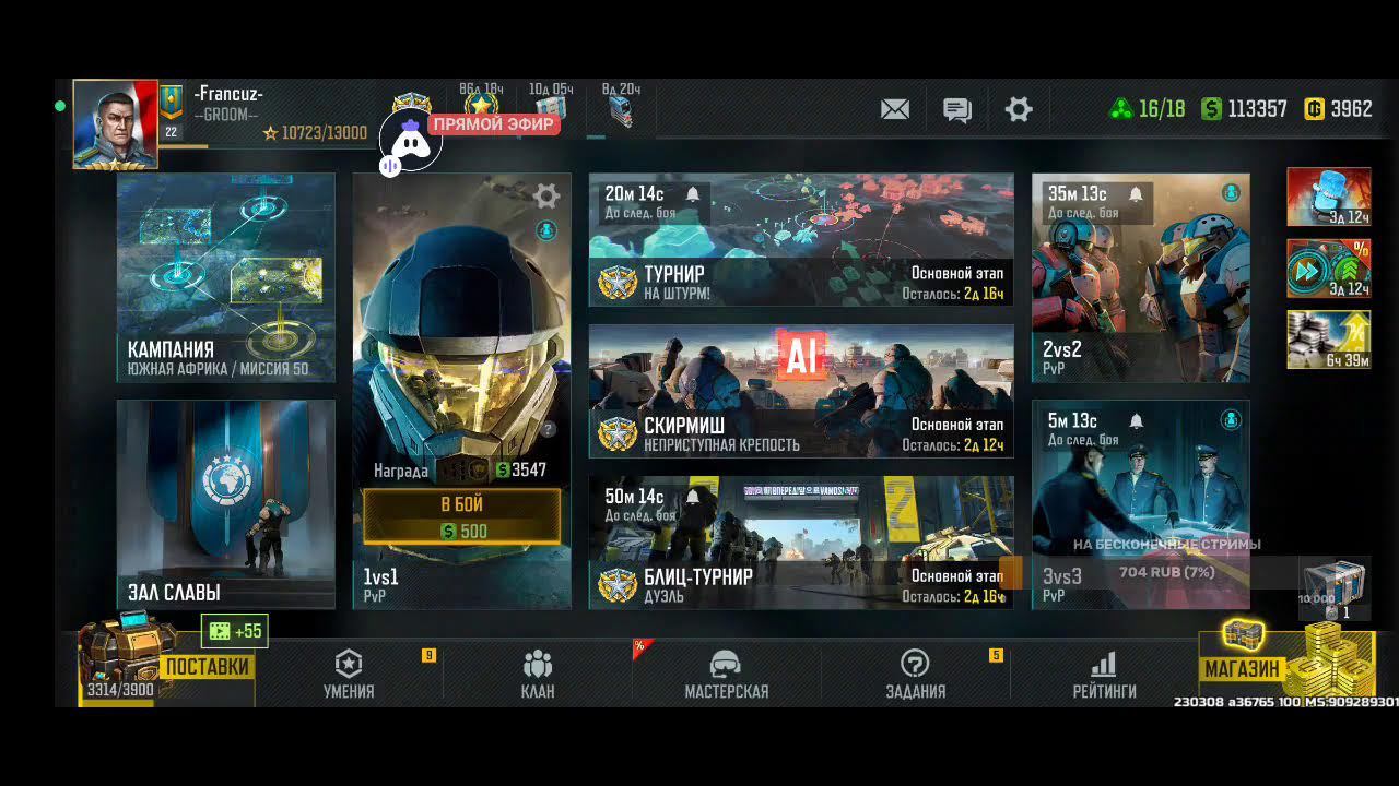 Поддержка автора по ссылке: https://www.donationalerts.com/r/rincks райффазен банк 2200 3005 1695 5281 телеграм группа для подписчиков https://t.me/art_of_war_3_rincks_sopra Продлить стрим:300 руб Смена фракции:200 руб Тренировка:300 руб 2х2: по совести Покажи кач: миллион рублей Закончить стрим:1000 руб Так же можно заказать челлендж. тоесть дать стримеру задание за определенную сумму. Например: сыграть только авиацией или вообще без неё,ну и так далее. Ссылка на игру: Долго искал настоящую стратежку на телефон, как старкрафт. Наконец нашел Art of War 3! Очень крутая игра! Вот ссылка, качай, тебе понравится: https://redirect.appmetrica.yandex.com/serve/169878688668608468?recruiter_id=1111515909
