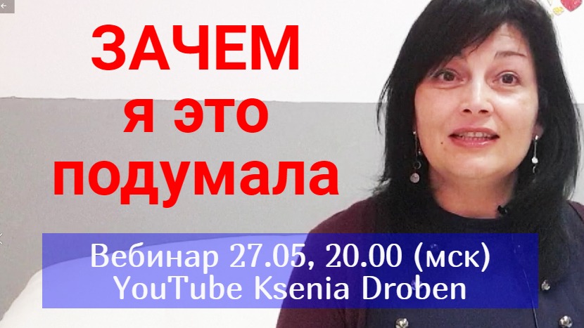 Сегодня у нас Пятница-Вебинарица. Сегодняшняя тема у нас «Зачем я это подумала»: мы будем разговаривать с вами о том, какие мысли и фразы явно или неявно мешают девочкам построить долгосрочные, счастливые и здоровые отношения По-научному это называется «саботаж» - мысли, которые нам мешают Приглашаю вас присоединиться к нашему разговору и навести порядок в мыслях и установках Мы встречаемся с Вами сегодня, в пятницу 27 мая, в 18.00 по Лондону, 19.00 по Германии, 20.00 по Москве и Киеву Место встречи: https://www.youtube.com/c/KseniaDrobenPartnervermittlung Или Facebook https://www.facebook.com/ksenia.droben/ Или Vkontakte https://vk.com/kseniadroben Буду рада встретиться с вами и ответить на ваши вопросы!