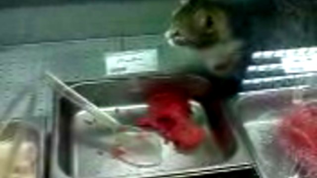 Кошка пожирает фарш в универсаме