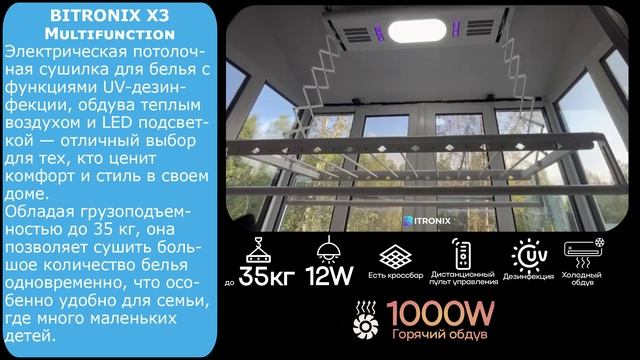 Cтильная и функциональная сушилка для белья BITRONIX X3 Multifunction Ваш идеальный выбор для удобной и безопасной сушки белья! BITRONIX X3 Multifunction – это современный прибор, сочетающий элегантный дизайн и передовые технологии. Он станет надежным помощником в вашем доме, обеспечивая комфорт и бережный уход за вещами. Преимущества BITRONIX X3 Multifunction: ✔ Выдерживает до 35 кг. Отлично подходит для больших объемов белья – идеальный вариант для семей. ✔ Два режима сушки Обычный обдув или подогретый воздух – выбирайте оптимальный способ для быстрого и равномерного высыхания. ✔ UV-стерилизация Уничтожает бактерии, вирусы и пылевых клещей, делая ваши вещи не только сухими, но и гигиенически чистыми. ✔ Энергосберегающая LED-подсветка (12 Вт) Мягкий свет без лишних затрат на электроэнергию. ✔ Управление с пульта Регулируйте работу сушилки, не вставая с места – просто и удобно! ✔ Экономия пространства Освобождает до 3 м² полезной площади, создавая больше места для жизни. ✔ Легкий монтаж Установка за считанные минуты с помощью подробной видеоинструкции – никаких специальных навыков не требуется. Выбирайте BITRONIX X3 Multifunction – комфорт, безопасность и экономия в одном устройстве! https://bi-tronix.com/smart-dryer/x3mlw/?utm_source=rutube&utm_medium=video&utm_campaign=video Контакты: 8 800 301 35 11 +7 967 979 31 50 WhatsApp/TG Rutube канал: https://rutube.ru/channel/51133044/ Яндекс Дзен : https://dzen.ru/bitronix Группа ВКонтакте: https://vk.com/bitronixdryer YouTube канал: https://youtube.com/@bitronixbitronix #BITRONIX #битроникс #умнаясушилкадлябелья #сушилкапотолочнаяэлектрическая #сушилкадлябельяпотолочнаяэлектрическая #сушилкадлябельяопускающаяся #smartсушилкадлябелья #сушилкаспультом #умнаясушилкадлябельяxiaomimijia #сушилкадлябельяxiaomiclothes #сушилкидлябельяспультом #сушилкадлябельясэлектроприводом #сушилкадлябельясфункциейобогрева #потолочнаясушилкаспультом #сушилкадлябельяпотолочнаяспультом #сушилкидлябельяsenspa #сушилкадлябельясяоми #сушилкадлябельясвентилятором #сушильныйшкафдляодежды #сушильнаямашина #стиральносушильнаямашина #сушилкадлябельяпотолочная #сушилкадлябельянабалкон #сушилкадлябельяпотолочнаянабалкон #сушилкадлябельявванную #сушилкадлябельянапольная #сушилкадлябельянастенная