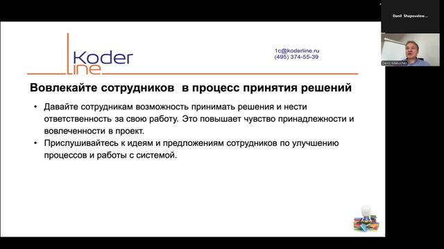 Компания «Кодерлайн» провела вебинар «Психология проекта автоматизации. Как мотивировать сотрудников и предотвращать ошибки с учетом психологических аспектов» Ведущий: Макушев Денис - Эксперт-аналитик Целевая аудитория собственники бизнеса, учредители, руководители компаний, помощники руководителей, бухгалтера, руководители и кураторы проектов. Описание Хотите создать команду, которая работает с энтузиазмом, вовлеченностью и без ошибок? Узнайте, как мотивация и психологические подходы могут преобразить ваш проект и улучшить результаты. Программа На вебинаре вы получите: ● Эффективные стратегии для повышения мотивации сотрудников. ● Психологические инструменты, которые снизят количество ошибок. ● Практические советы по созданию поддерживающей и продуктивной рабочей среды. Этот вебинар станет вашим путеводителем к успешной, мотивированной команде, которая движется к цели без препятствий. Присоединяйтесь и сделайте первый шаг к преобразованию вашей команды!