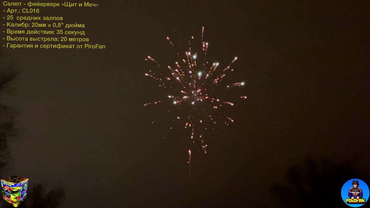 Салют, фейерверк 25 залпов средних "Щит и Меч" - Калибр: 20мм = 0,8" дюйма - Время действия: 35 секунд - Высота выстрела: 20 метров - Годен до 2026 года - Есть сертификат и гарантия на товар - Уточнить наличие/Заказать/Полная консультация профессионалов +7 963 613-16-93 - Наш адрес: Москва, Метро Новогиреево, Саянская 11 корпус 1 - Осуществляем доставку по всей России