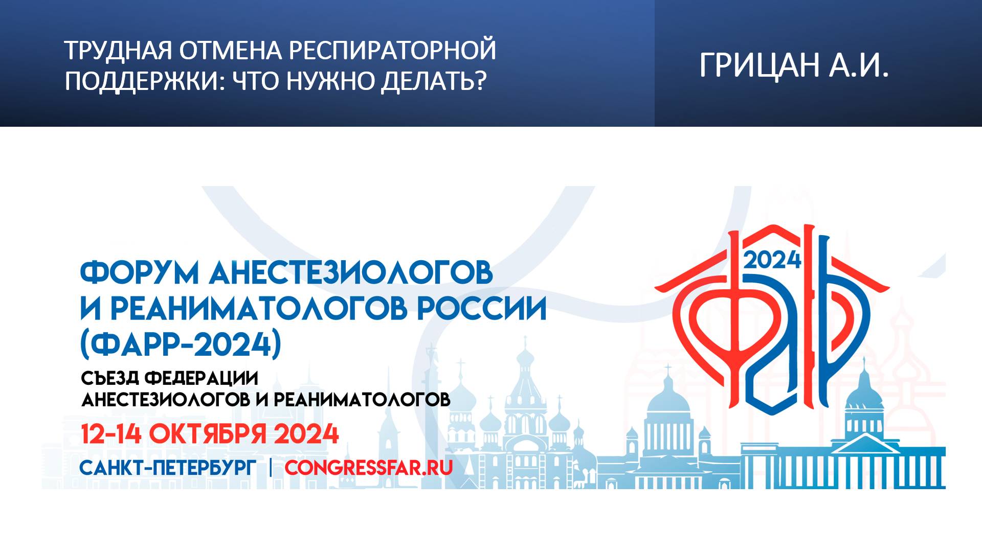 Видеозапись ФАРР-2024, XXII съезд Федерации анестезиологов и реаниматологов 12-14 октября 2024, Санкт-Петербург. Алексей Иванович Грицан "Трудная отмена респираторной поддержки: что нужно делать?" Информация, размещенная на канале, предназначена исключительно для медицинских специалистов