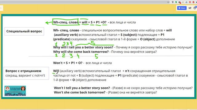 Разбираем на примерах формулу, структуру специального вопроса и общего вопроса с отрицанием во времени Future Simple Tense.