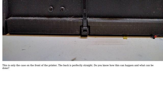3D Printing: Wanhao duplicator i3 print bed support warped The Question: As you can see in the picture, my heated bed support is too low on the right side, even touching the Y-axis chassis end plate. [The_front_of_the_printer,_from_where_you_can_see_the_heated_bed_support leaning_down_on_the_right,_even_touching_the_Y-axis_chassis.] This is only the case on the front of the printer. The back is perfectly straight. Do you know how this can happen and what can be done? Solutions: Please watch the whole video to see all solutions, in order of how many people found them helpful With thanks & praise to God, and with thanks to the many people who have made this project possible! | Content (except music & images) licensed under cc by-sa 3.0 | Music: www.bensound.com/royalty-free-music | Images: stocksnap.io/license & others | With thanks to user Hacky (askubuntu.com/users/4708), user fred_dot_u (askubuntu.com/users/854), and the Stack Exchange Network (3dprinting.stackexchange.com/questions/2990). Trademarks are property of their respective owners. Disclaimer: All information is provided "AS IS" without warranty of any kind. You are responsible for your own actions. Please contact me if anything is amiss at Roel D.OT VandePaar A.T gmail.com.
