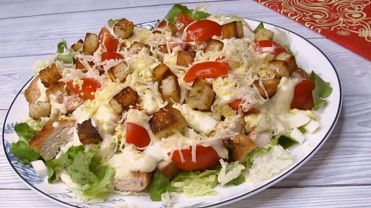 Шикарный салат, не зря его любят все...А если не любите, то приготовьте по этому рецепту, мнение своё о нём измените! Рецепт: Куриное филе - 1 шт Для сухариков - 3 кусочка батона Помидоры - 6 шт, лучше черри Яйца - 2 шт Сыр - 40 гр Салат - айсберг или пекинская капуста + салатные листья Маринад для курицы: Растительное масло - 1 ст.л Соевый соус - 1 ст.л Паприка - 0,5 ч.л Перец, соль по вкусу Чеснок - 1 зубчик Заправка для салата: Майонез 2 ст.л Горчица - 0,5 ч.л Лимонный сок - 1 ст.л (не больше) Соль, перец по вкусу Чеснок - 1-2 зубчика