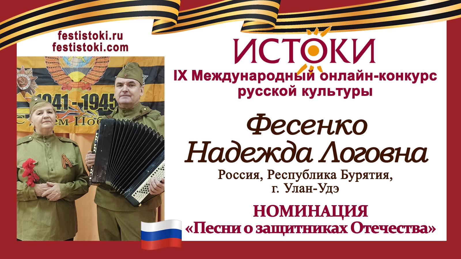 Участник IХ Международного онлайн-конкурса русской культуры "Истоки". Номинация "Песни о защитниках Отечества". Песня "Сестричка". Музыка Марк Фрадкин, Слова Игорь Шаферан. Сайт: festistoki.ru / festistoki.com E-mail: festistoki@mail.ru