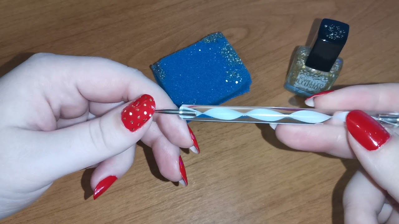 7. Красный маникюр с золотыми блестками