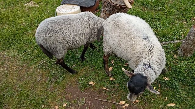 3 мая 2025 года. Козлята и овечки пасутся. Уже привыкли к своему жилью, к участку и к новым хозяевам. День довольно тёплый.