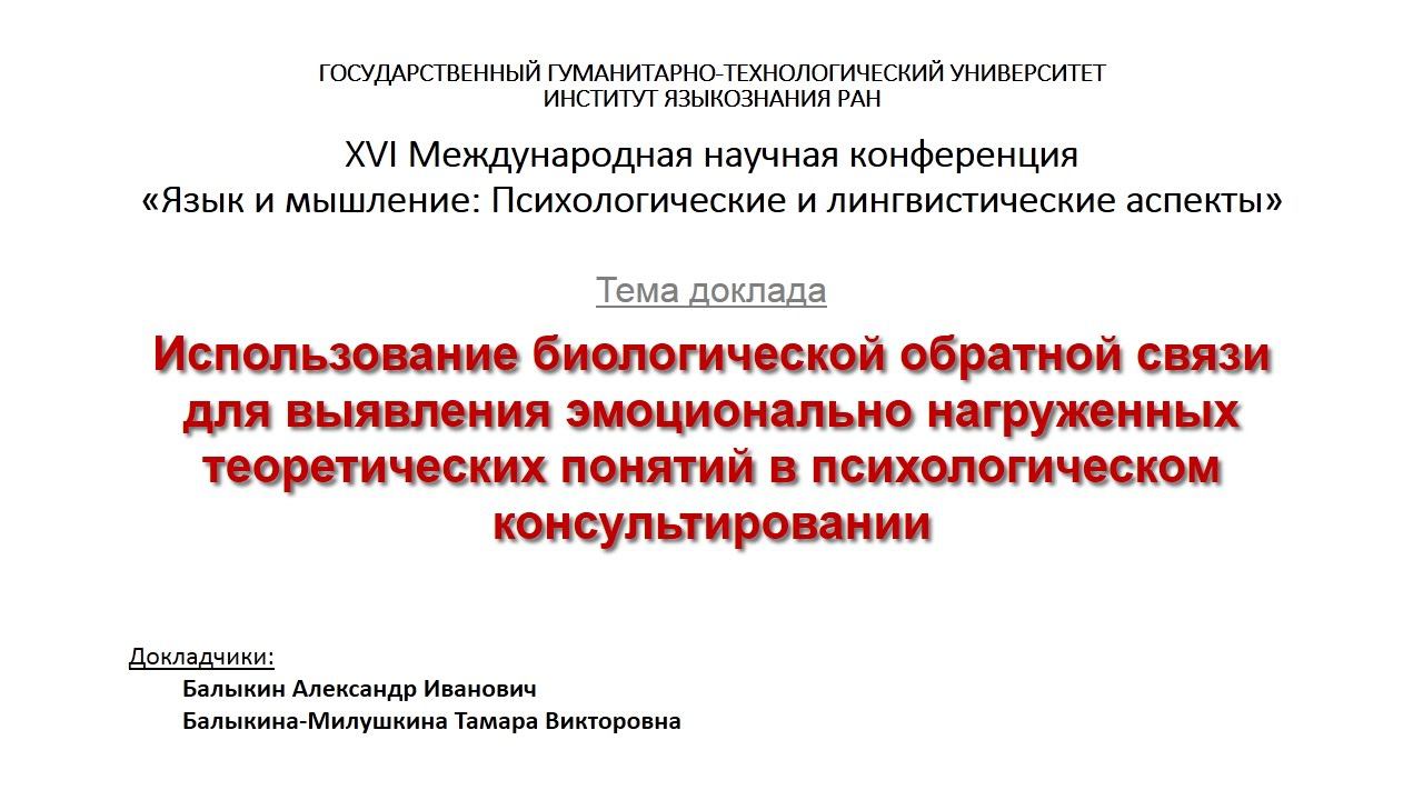 ГОУ ВО МО «Государственный гуманитарно-технологический университет» совместно с Институтом языкознания РАН и Мозырским государственным педагогическим университетом (Беларусь) провели XVII-ю Международную научную конференцию «Язык и мышление: Психологические и лингвистические аспекты». На конференции Александром Балыкиным и Тамарой Балыкиной-Милушкиной был зачитан доклад "Использование биологической обратной связи для выявления эмоционально нагруженных теоретических понятий в психологическом консультировании" Приборы для самопознания или для психологической консультации - http://www.iper1k.ru Техники саморазвития - психологическая консультация - http://www.osoznanie.biz Мой канал на youtube - https://www.youtube.com/user/Ivanovih808 --------- Подборка наших видео научных докладов по темам - спортивная психология - педагогика - самопознание - бизнес https://www.youtube.com/playlist?list=PLbNVCpO4w-QlmIzZmpEe8gqi9vSsDKw42 --------- Подборка видео-семинаров для людей, занимающихся саморазвитием и самопознанием. https://www.youtube.com/playlist?list=PLbNVCpO4w-Qk2m38hJNHIMBLvV5vT8Ap3 --------- Подборка для психологов, психотерапевтов, коуч, педагогам, медикам, социальным работникам - видео семинаров по проведению психодиагностики и психокоррекции нежелательных состояний у клиентов. https://www.youtube.com/playlist?list=PLbNVCpO4w-Ql_O5OIz6PANIWEHXdq0nGs --------- Подборка видео семинаров по межличностным взаимоотношениям, семейной жизни, воспитанию детей. https://www.youtube.com/playlist?list=PLbNVCpO4w-Qm5QjmKJqQ5HGLVeTSZaSM6 --------- Подборка для кадровиков, эйчаров, HR-специалистов, руководителей и собственников компаний - видео семинаров по отбору, проверке, обучению и управлению персоналом. https://www.youtube.com/playlist?list=PLbNVCpO4w-QnejSf2iD67U29zWeFIN912 --------- Подборка для спортсменов и тренеров - видео семинаров по спортивной психологии https://www.youtube.com/playlist?list=PLbNVCpO4w-QkZSP_MiMHns9xBPiNle6Lt --------- Все наши публикации в научных журналах, а также видео семинаров и мастер-классов, можно скачать по этой ссылке http://www.iper1k.ru/images/upload/00_publikasii_garmonii.pdf