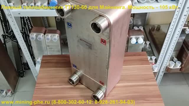 Паяный пластинчатый теплообменник ТТ130-60 для майнинга (иммерсионное охлаждение асиков). Аппарат обладает следующими характеристиками: Мощность - 105 кВт. Иммерсионную жидкость охлаждает с 65С до 45С Охладителем является вода, с температурой 15С Патрубки: Ду50 ("2"), наружная резьба Поверхность теплообмена (7,8 м2) - 60 пластин Расход по иммерсионной жидкости - 9,5 т./ч. Расход по охладителю (воде) - 4,52 т./ч. Теплообменник специально разработан для работы с вязкими иммерсионными маслами!