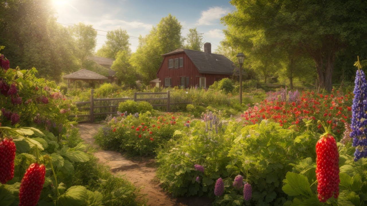 Край весны 2024, начало лета, люпины в огороде под ЛЭП Холодный май с заморозками не позволил посадить рассаду, посеял только укроп и редиску еще в апреле, сегодня снял первый урожай. Заморозки пришли в разгар цветения плодовых деревьев, так что а этом году не будет яблок, груш, слив, но будет ягода: смородина и черная и белая и красная, крыжовник. Земляника и клубника цветет обильно, уже во второй раз - первая попытка облетела. Весь май светило яркое солнце не давая посадить рассаду в открытый грунт, солнце все сжигает. Посадил перец, помидоры, огурцы в затененный парник. Впервые зацвел виноград, несколько кисточек. Cold May with frosts did not allow to plant seedlings, sowed only dill and radish in April, today I took the first harvest. Frosts came at the height of flowering fruit trees, so this year there will be no apples, pears, plums, but there will be berries: currants and black and white and red, gooseberries. Strawberries and strawberries bloom abundantly, for the second time - the first attempt flew off. All May shone bright sun not giving to plant seedlings in the open ground, the sun burns everything. Planted peppers, tomatoes, cucumbers in a shaded greenhouse. For the first time blossomed grapes, a few tassels. Промпт CINEMATIC Create a detailed image of a garden scene in late spring 2024, transitioning to summer, featuring lupines in bloom under overhead power lines. The style should be naturalistic, capturing the essence of a bountiful but challenging gardening season with specific elements like dill, radishes, berries, and blossoming strawberries and grapes. Show the effects of frost and intense sunlight on the crops, emphasizing the lush greenery and colorful fruits. The viewpoint should be from a ground-level perspective, showcasing the vibrant array of plants and flowers under a bright, clear sky. Incorporate lighting that accentuates the natural colors and textures, enhancing the overall atmosphere of growth and resilience despite obstacles.