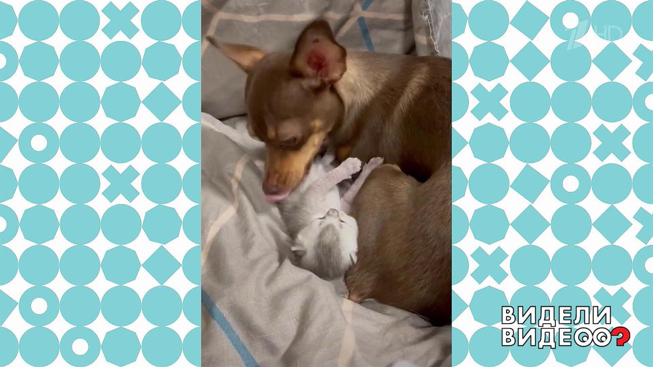 Той-терьер Кими трогательно ухаживает за котенком.