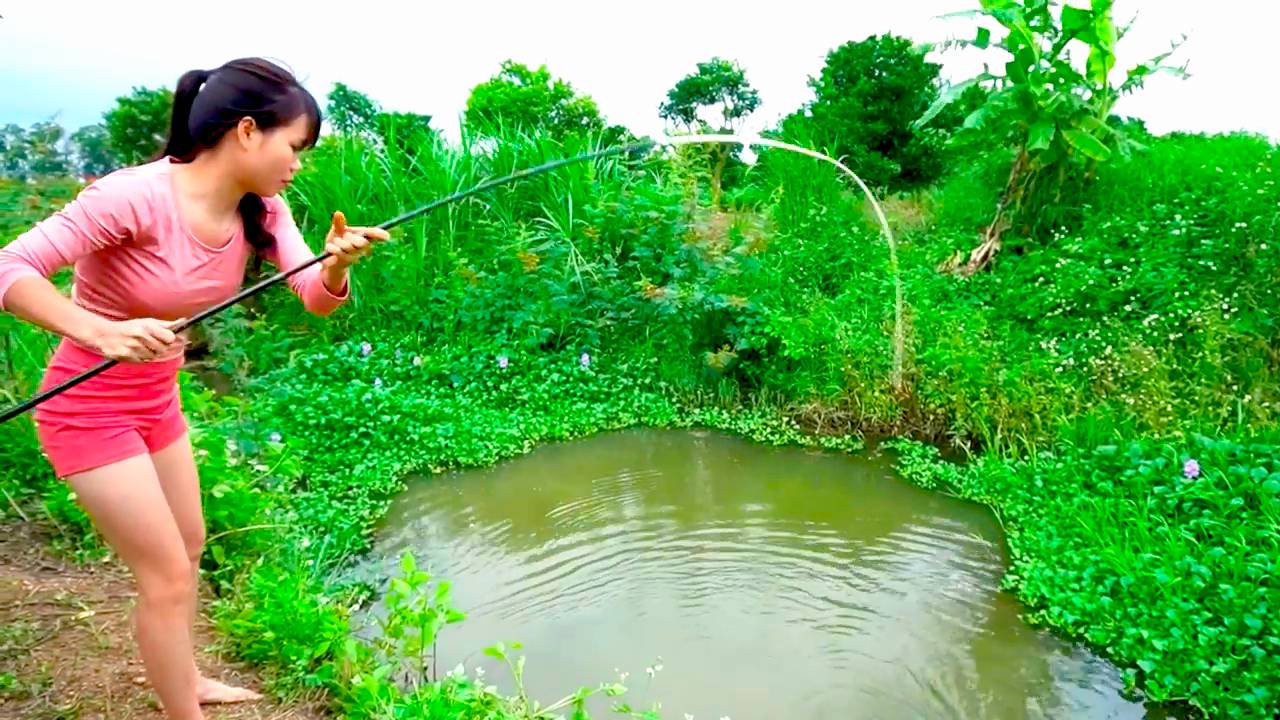 Рыбалка Красивая Девушка ловит большую рыбу на поплавочную удочку в заросшем водоеме