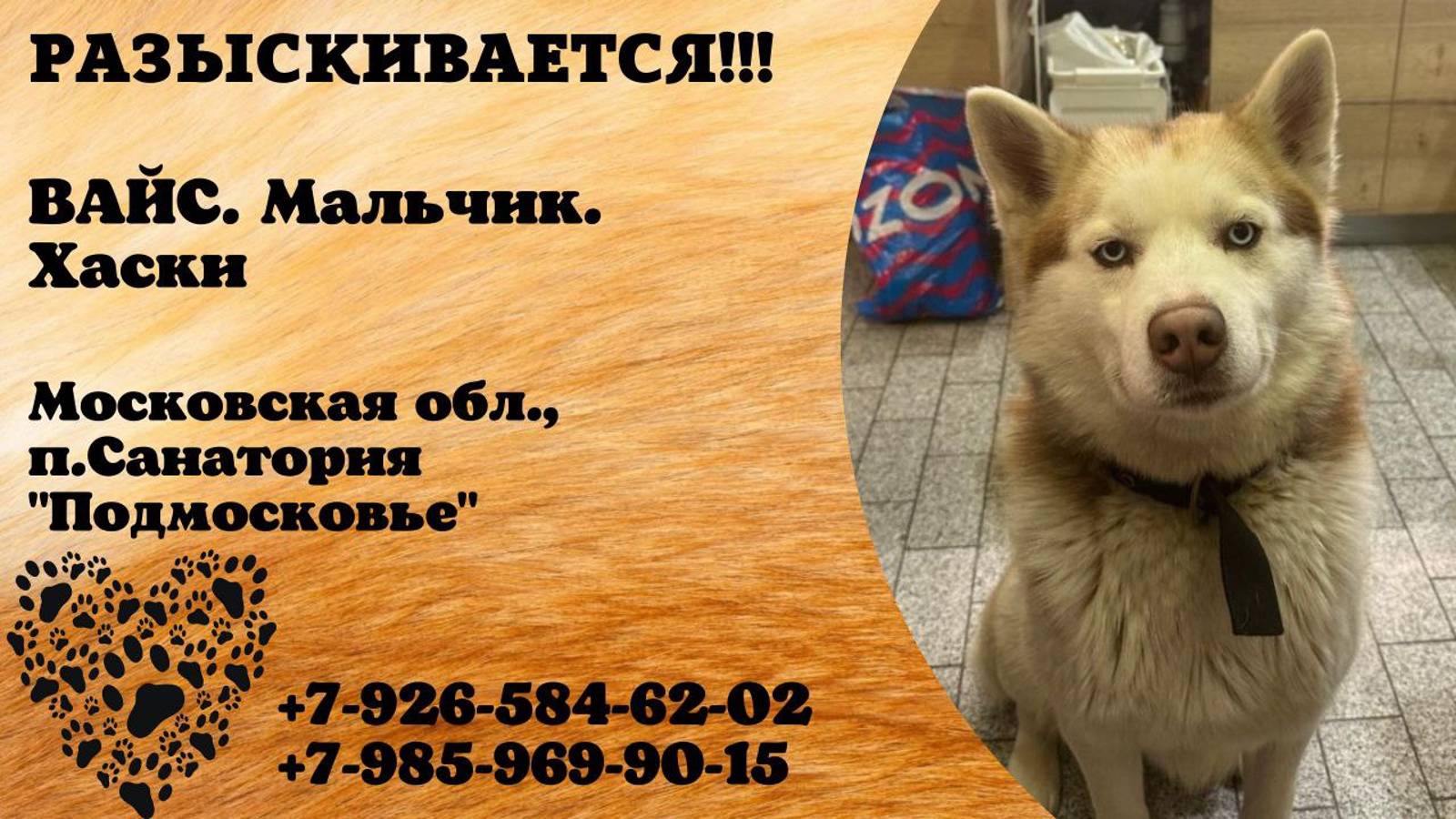 Московская Посёлок санатория «Подмосковье» Пропала собака Потерялся кобель хаски. Цвет рыже-коричневый с белым. Кличка Вайс. На ошейнике телефон. Чипирован Имя хозяина: Дмитрий Телефон: +7 985 969-90-15 Адрес: Посёлок санатория «Подмосковье», Московская область Инфо: https://vk.com/wall-198815410_148861