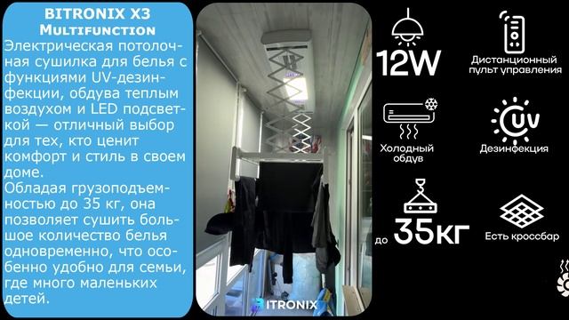 Cтильная и функциональная сушилка для белья BITRONIX X3 Multifunction Ваш идеальный выбор для удобной и безопасной сушки белья! BITRONIX X3 Multifunction – это современный прибор, сочетающий элегантный дизайн и передовые технологии. Он станет надежным помощником в вашем доме, обеспечивая комфорт и бережный уход за вещами. Преимущества BITRONIX X3 Multifunction: ✔ Выдерживает до 35 кг. Отлично подходит для больших объемов белья – идеальный вариант для семей. ✔ Два режима сушки Обычный обдув или подогретый воздух – выбирайте оптимальный способ для быстрого и равномерного высыхания. ✔ UV-стерилизация Уничтожает бактерии, вирусы и пылевых клещей, делая ваши вещи не только сухими, но и гигиенически чистыми. ✔ Энергосберегающая LED-подсветка (12 Вт) Мягкий свет без лишних затрат на электроэнергию. ✔ Управление с пульта Регулируйте работу сушилки, не вставая с места – просто и удобно! ✔ Экономия пространства Освобождает до 3 м² полезной площади, создавая больше места для жизни. ✔ Легкий монтаж Установка за считанные минуты с помощью подробной видеоинструкции – никаких специальных навыков не требуется. Выбирайте BITRONIX X3 Multifunction – комфорт, безопасность и экономия в одном устройстве! https://bi-tronix.com/smart-dryer/x3mlw/?utm_source=rutube&utm_medium=video&utm_campaign=video Контакты: 8 800 301 35 11 +7 967 979 31 50 WhatsApp/TG Rutube канал: https://rutube.ru/channel/51133044/ Яндекс Дзен : https://dzen.ru/bitronix Группа ВКонтакте: https://vk.com/bitronixdryer YouTube канал: https://youtube.com/@bitronixbitronix #BITRONIX #битроникс #умнаясушилкадлябелья #сушилкапотолочнаяэлектрическая #сушилкадлябельяпотолочнаяэлектрическая #сушилкадлябельяопускающаяся #smartсушилкадлябелья #сушилкаспультом #умнаясушилкадлябельяxiaomimijia #сушилкадлябельяxiaomiclothes #сушилкидлябельяспультом #сушилкадлябельясэлектроприводом #сушилкадлябельясфункциейобогрева #потолочнаясушилкаспультом #сушилкадлябельяпотолочнаяспультом #сушилкидлябельяsenspa #сушилкадлябельясяоми #сушилкадлябельясвентилятором #сушильныйшкафдляодежды #сушильнаямашина #стиральносушильнаямашина #сушилкадлябельяпотолочная #сушилкадлябельянабалкон #сушилкадлябельяпотолочнаянабалкон #сушилкадлябельявванную #сушилкадлябельянапольная #сушилкадлябельянастенная