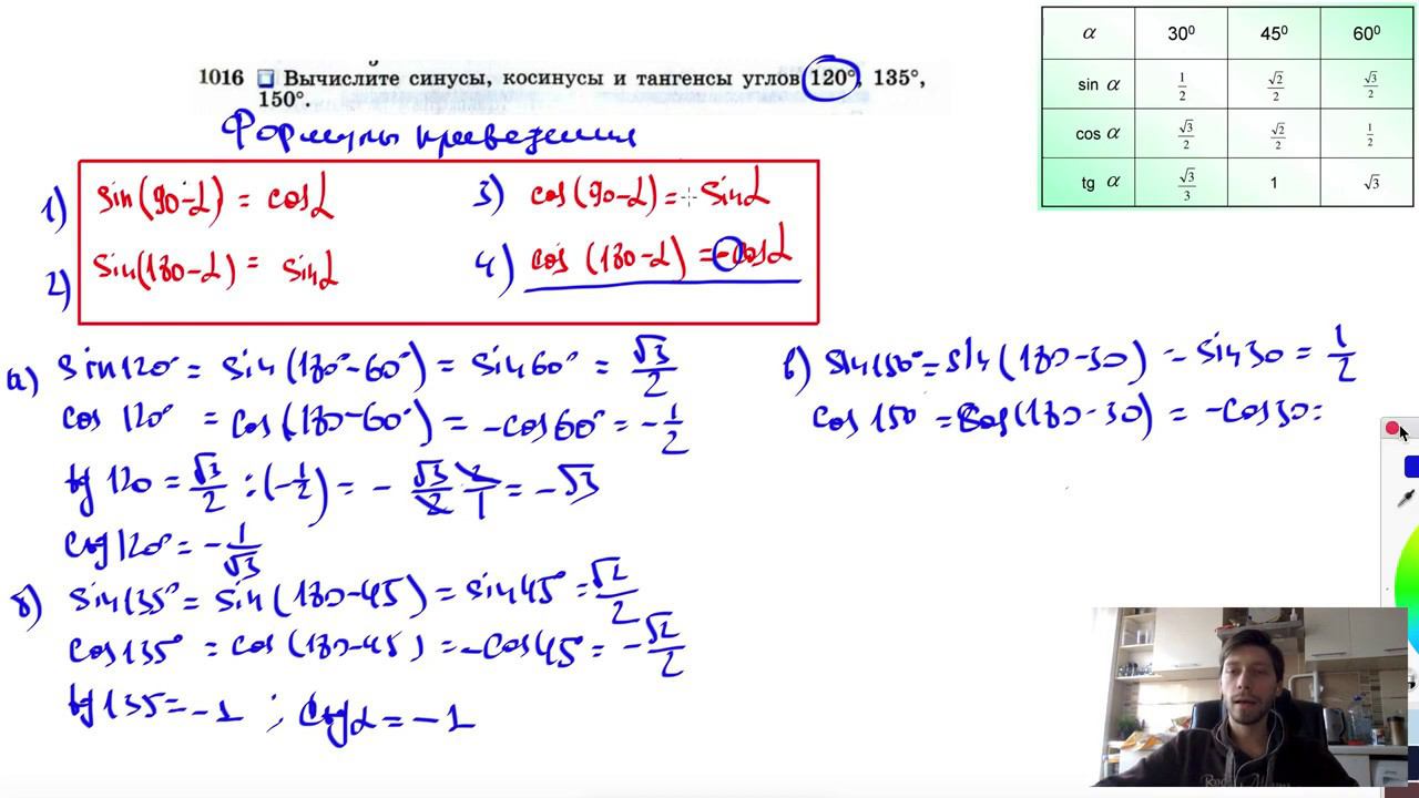 №1016. Вычислите синусы, косинусы и тангенсы углов 120°, 135°, 150°. Поддержать канал рублём - 5469400944002125 (Сбербанк) Мой второй канал для подготовки к ЕГЭ и ОГЭ - https://www.youtube.com/ЕвгенийСумин Инстаграм - https://www.instagram.com/EGE_OGE.math Личный инстаграм - https://www.instagram.com/ee_sumin VK - https://vk.com/evgeniysumin FB - https://www.facebook.com/EvgeniySumin