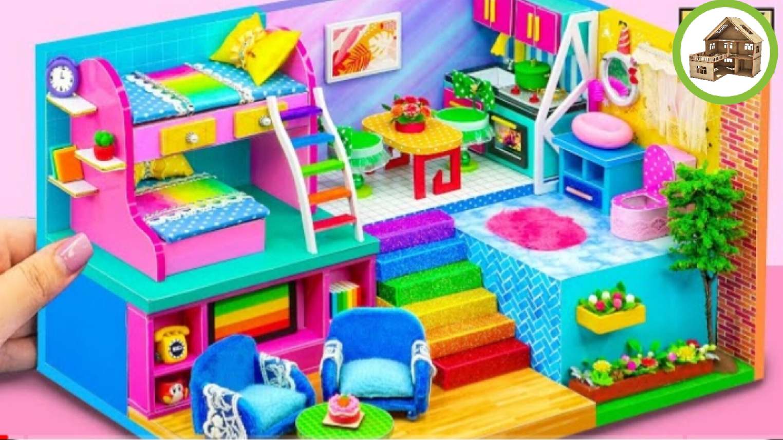 Миниатюрный облычный домик с 4 комнатами и двухъярусной кроватью для семьи из картона /135