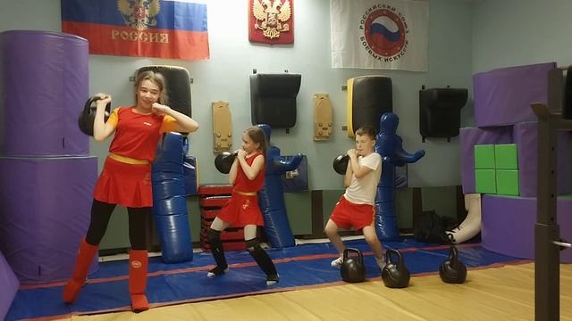 ушу-саньда.ОФП. силовая.гири. дети 10-12 лет. Харитоновы Софья и Денис,Горбунова Алиса.тренер Ильин