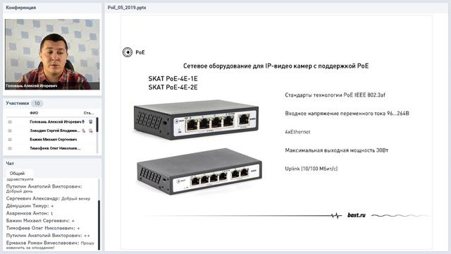 Вебинар "Новая линейка PoE-коммутаторов SKAT" “БАСТИОН” — российская научно-производственная компания, осуществляющая разработку, производство и поставки профессиональных источников бесперебойного питания, cтабилизаторов, сетевой защиты и другого электротехнического оборудования. “БАСТИОН” серийно выпускает более 450 моделей приборов. Торговая марка “СКАТ” (SKAT) известна всем профессионалам рынка безопасности. Программа вебинара 1. Краткая презентация технических решений от компании "БАСТИОН" для рынка безопасности 2. Обзор 1-канальных PoE-инжекторов SKAT 3. Обзор PoE-коммутаторов SKAT 4. Сплиттеры и репитеры SKAT Лектор - инженер учебного центра компании "БАСТИОН" Головань Алексей Игоревич Вебинар состоялся при поддержке ООО "ТД ТИНКО" 08.10.2019 PoE-коммутаторы SKAT в Каталоге ТСБ "ТД ТИНКО": https://www.tinko.ru/catalog/category/0/filter/17-is-1900/28-is-2928/