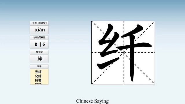 纤 (xiān) fine; delicate; minute; (qiàn) boatman's tow-rope - HSK