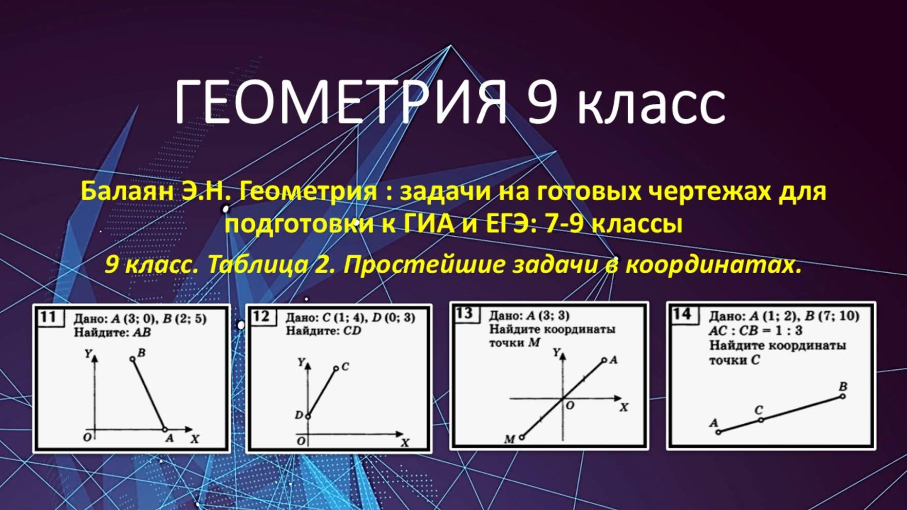 https://dzen.ru/profile/editor/irinaklok https://vkvideo.ru/@club228129393 Геометрия 9 класс по учебнику Атанасяна. В этом видео решаем задачи из сборника Балаяна Э.Н. Геометрия : задачи на готовых чертежах для подготовки к ГИА и ЕГЭ: 7-9 классы. 9 класс. Таблица 2. Простейшие задачи в координатах. 00:00:00 Задача № 11 00:02:17 Задача № 12 00:03:27 Задача № 13 00:06:48 Задача № 14