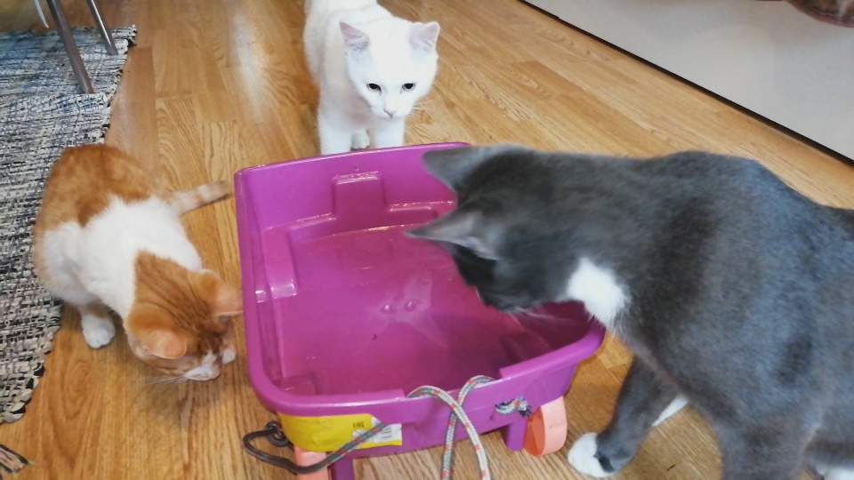 Купила нашим троим котам (сокращенно "трикотажу") игрушечную машину, и они полюбили в ней кататься.