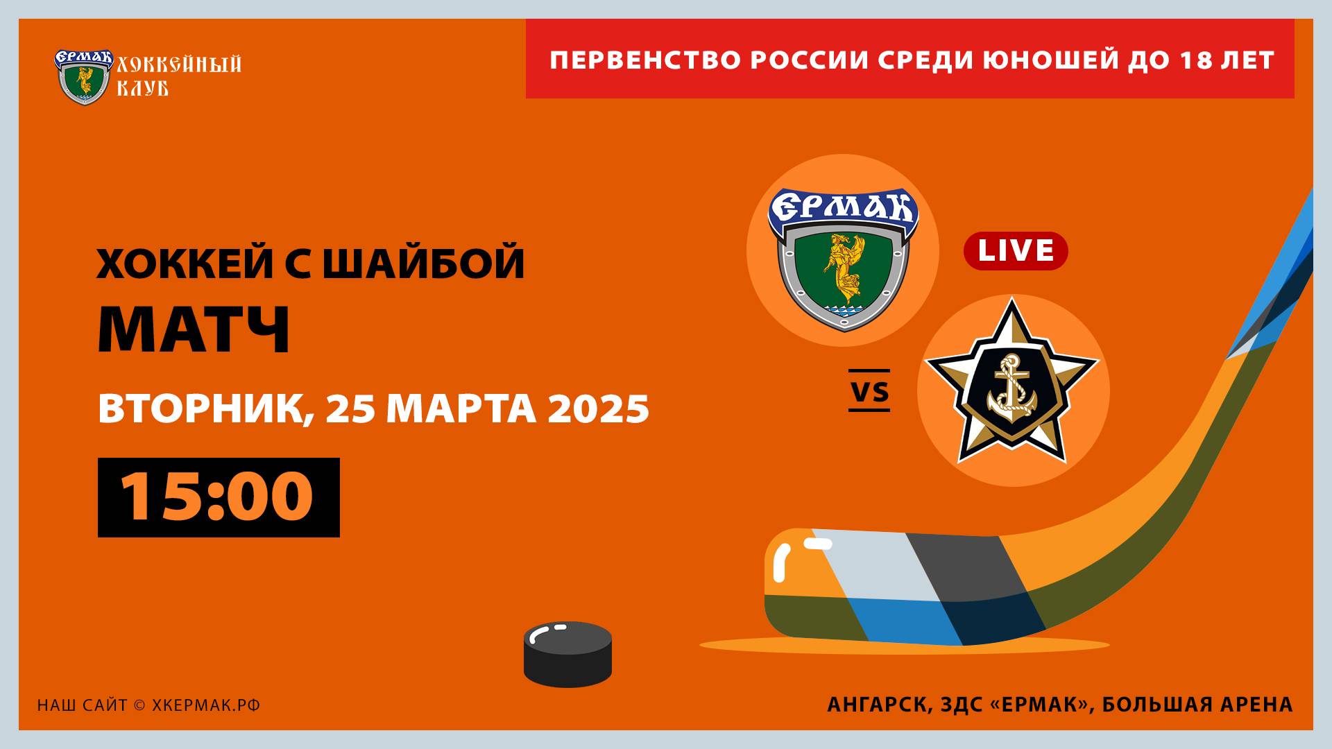 Первенство ЮХЛ по хоккею среди юношей до 18 лет. Матч между командами «Ермак» (Ангарск) и «Адмирал» (Владивосток). 25 марта 2025 г., .г Ангарск, ЗДС «Ермак»