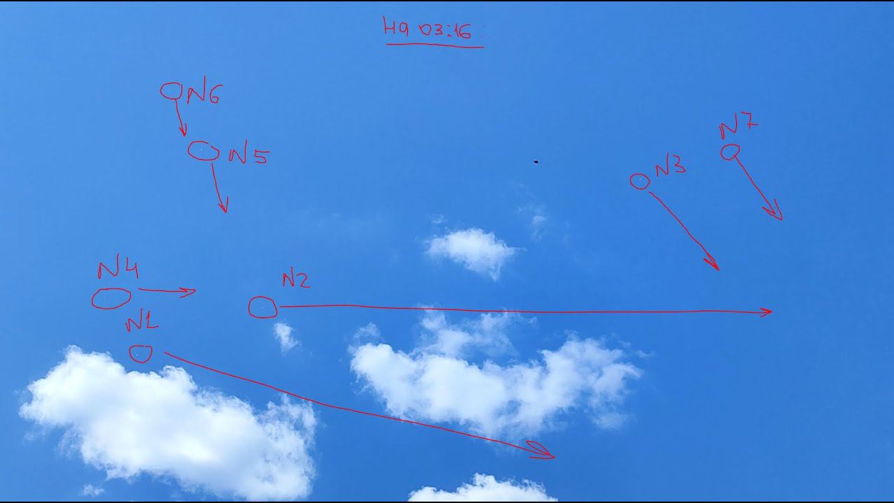 21.05.2023 Фрагмент №2 из исходного видео от 18.05.2023 г. Замедление 18%, тайминг 22:20 - 22:35, НЛО 9 ш Смотреть ролик лучше на хорошем мониторе, 32-40 дюймов с высоким разрешением. Исходное видео на ютьюб: https://youtu.be/wASMmv_SORw Время исходного ролика: 1 час 6 минут. Фрагмент данного видео в замедленном показе вырезан из исходного видео по таймингу: 22:19 - 22:35 Длительность фрагмента: 4 минуты 35 секунд Тайминг: Всего зафиксировано 9 штук НЛО в виде белых шаров, двигающихся, в основном, слева направо. Одно НЛО появляется в левой части экрана снизу, в 02:12 Восемь остальных НЛО появляются на тайминге с 03:16 1. НЛО №1 старт 01:59. НЛО №1 Вылет из нижней части экрана справа. Направление полета: ровно вверх, на 12 часов. 2. НЛО №2-7 старт 03:12. НЛО №2 Вылет из верхнего левого края левого облака. Направление полета: на 3 часа. Остальные НЛО вылетали из верхней части экрана практически одновременно 3. НЛО №8-9 старт 03:37. Вылет из верхнего левого края экрана. Направление полета: вектор на 5 часов.