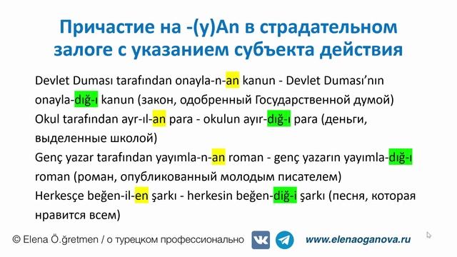 Все учебники, соавтором которых я являюсь, вы можете приобрести в нашем интернет-магазине http://elenaoganova.tilda.ws/, или написав мне на почту ova8@yandex.ru Создание каждой лекции - огромный труд, требующий время- и энергоресуров. Если вы хотите поддержать мой канал на ютьюбе и видеть новые лекции на нем, можете перевести на карту Сбербанка любую сумму: на карту Сбербанка 2202 2068 9075 2608 (Оганова Елена Александровна). Заранее благодарю всех! В этой лекции мы рассмотрим особенности образования и употребления причастия на -(y)An в страдательном залоге в страдательном залоге и разберем разницу между ним и глагольным именем на -DIk. В конце лекции вас ждет небольшой практикум по переводу с разбором и объяснением.