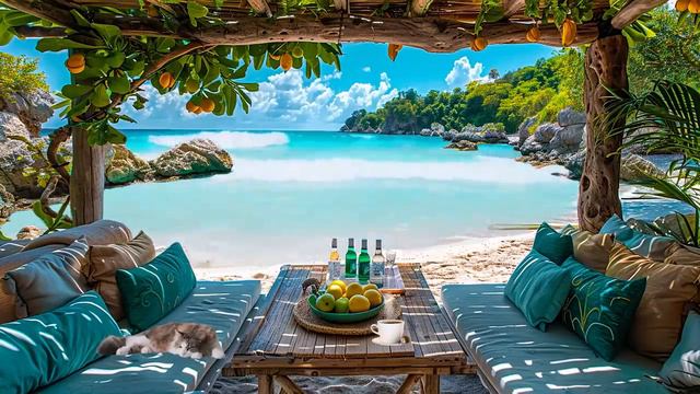 Happy Summer Retreat Ambience & Sea Waves. Tropical Bossa Nova Jazz at Cozy Coffee/