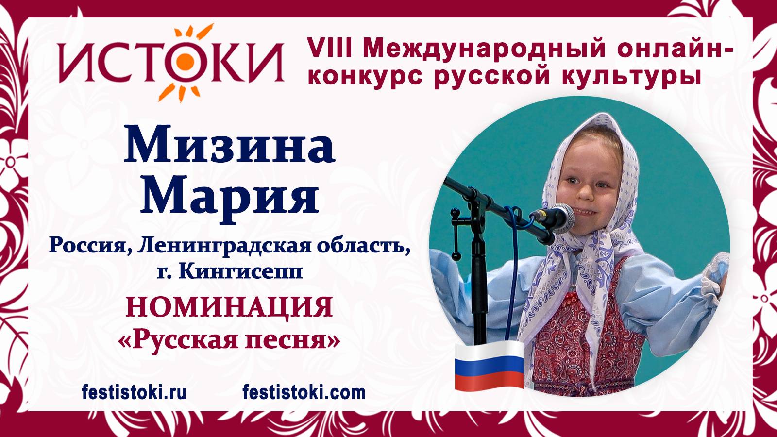 Участник VIII Международного онлайн-конкурса русской культуры "Истоки". Номинация "Русская песня". Русская народная песня "Пошла млада за водой". Сайт: festistoki.ru / festistoki.com E-mail: festistoki@mail.ru