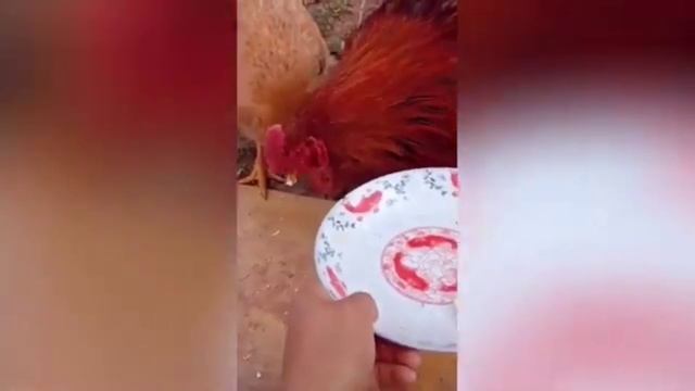 Хозяйка приносит еду, а курица берет ее клювом и кормит своего суженого.