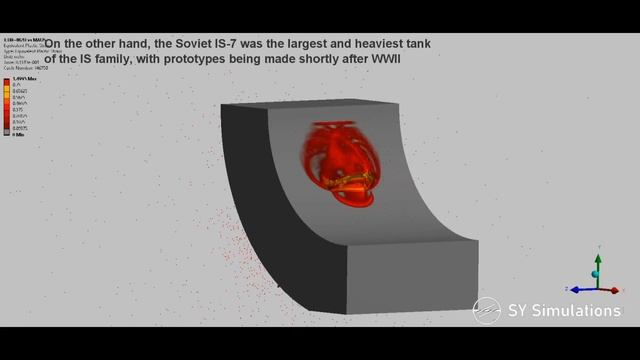The German Maus was the heaviest tank ever made, with prototypes being developed towards the end of WWII. Meanwhile, the Soviet IS-7 had its first prototypes made shortly after the war. The simulation presents the impact of the IS-7's 130mm BR-482B projectile on the lower cheek of the Maus, from close range. The turret cheek of the Maus has been modelled as 232mm thick, in line with Warthunder. However, the only existing Maus was assessed to have a 220mm thick turret front, but there are various sources out there which state that the planned thickness was supposed to be higher -some even stating 240mm. It has been modelled as 220BHN good quality RHA. As the hardening profile is not available for BR-482B, the first set of simulations show the result of the projectile having very good quality metallurgy -similar to some post-war Soviet shells (like later versions of 100mm BR-412D) which have a maximum hardness in the nose of ~650BHN. As this may have not been the case for the IS-7 in the late 40's, the last two visualisations show the same scenario with the hardness reduced to ~450BHN maximum, with poorer WWII Soviet metallurgy. Amazing thumbnail artwork from: JEROLPOA https://sketchfab.com/3d-models/panzerkampfwagen-viii-maus-ww2-heavy-tank-62d434b25206416fb9eb22cd1d141ebc
