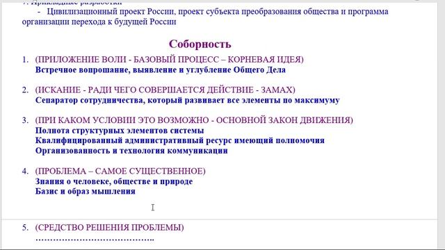 ИП 1 Соборность _ 11 05 23 Файл в формате ПДФ: https://drive.google.com/file/d/1lpJU0s93Bj-EjtmiZby-qDkZ0VybdReu/view?usp=share_link Публикация: https://fabulae.ru/note.php?id=65646 Соборность – свободное духовное единение людей, общение в братстве и любви. Соборность – свободная от догм общность людей и их единение на трёх основаниях: - Народность – компетентное участие людей на представительской основе в делах государства, как в системе коллективного принятия решений. - Духовность – общность ценностей и требований к человеку и обществу, исходя из достоверных знаний о мире, опыта и основанной на этих знаниях вере. - Державность – совместная выработка и принятие наиболее обоснованного решения по принципу «много умов – одна воля» с определением ответственного «державника», который будет отстаивать, продвигать и держать ответ за исполнения общего решения. План (?) 1. Согласование понятий - Метод, нахождение и словарь общих терминов 2. Аксиоматика - Формулировки, от которых мы отталкиваемся в разработке 3. Проблематизация - Критический анализ, выявление главной причины проблем 4. Выбор методов - Исследование, отбор и разработка необходимых методов 5. Общенаучное исследование - Уточнение картины Мира и парадигмы нашего мышления 6. Предметные исследования - Общая теория общества, методология и идеология его устройства 7. Прикладные разработки - Цивилизационный проект России, проект субъекта преобразования общества и программа организации перехода к будущей России Соборность 1. (ПРИЛОЖЕНИЕ ВОЛИ - БАЗОВЫЙ ПРОЦЕСС – КОРНЕВАЯ ИДЕЯ) Выявление и углубление Общего Дела - Встречное вопрошание - ………….. - ………………… 2. (ИСКАНИЕ - РАДИ ЧЕГО СОВЕРШАЕТСЯ ДЕЙСТВИЕ - ЗАМАХ) Сепаратор сотрудничества развивающий все элементы по максимуму 3. (ПРИ КАКОМ УСЛОВИИ ЭТО ВОЗМОЖНО - ОСНОВНОЙ ЗАКОН ДВИЖЕНИЯ) Полнота структурных элементов системы Квалифицированный административный ресурс имеющий полномочия Организованность и технология коммуникации 4. (ПРОБЛЕМА – САМОЕ СУЩЕСТВЕННОЕ) Знания о природе, обществе и человеке Базис, основания и образ мышления соответствующий моменту Критический анализ и организация обратной связи (сопоставление реальности с идеалом) 5. (СРЕДСТВО РЕШЕНИЯ ПРОБЛЕМЫ) Собирательство необходимых дополнений Совместное восхождение к смыслам, сути и сущности Сборка и консолидация усилий 6. (РЕЗУЛЬТАТ) Синтез целостности – Единение – Индивидуализация 7. (КРИТЕРИЙ ПОЛНОТЫ ДОСТИЖЕНИЯ РЕЗУЛЬТАТА) Новая ступень качества жизни 8. (ПРИМЕНЕНИЕ В ЖИЗНИ) Совершенствование всех аспектов жизни 9. (ЦЕЛЬ) Обретение счастья 10. (СОВЕРШЕНСТВОВАНИЕ ИНСТРУМЕНТОВ И КАЧЕСТВА) Раскрытие внутренних потенциалов всех элементов системы 11. (СМЫСЛ ЭТОГО ПУТИ) Поступательное позитивное продвижение – Прогресс – Разумное развитие 12. (ВОПЛОЩЕНИЕ) Совместное творение и радость от созерцания его Выявление и углубление ОД – Полнота структуры – Совместное восхождение – Новая ступень Сепаратор сотрудничества – Знание-Мышление-Обр. связь – Синтез целостности Выявление и углубление ОД при совместном восхождении к смыслам учит глубокому знанию, мышлению и рефлексии и приводит к полноте структуры и организованности, чтобы на основе синтеза целостности создать сепаратор сотрудничества и дорасти до новой ступени качества жизни. Реализационный синтез: Собирательство необходимых дополнений, совместное восхождение к смысла