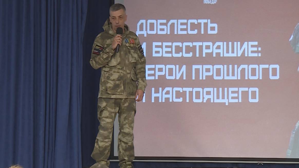 Перед учениками выступил Константин Панов. Он вернулся из зоны СВО в декабре 2023 года. Отправился добровольцем, служил в штурмовом подразделении.
