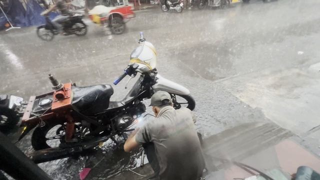 Мой кхмерский друг по имени Стакан варит глушитель мопеда под тропическим ливнем