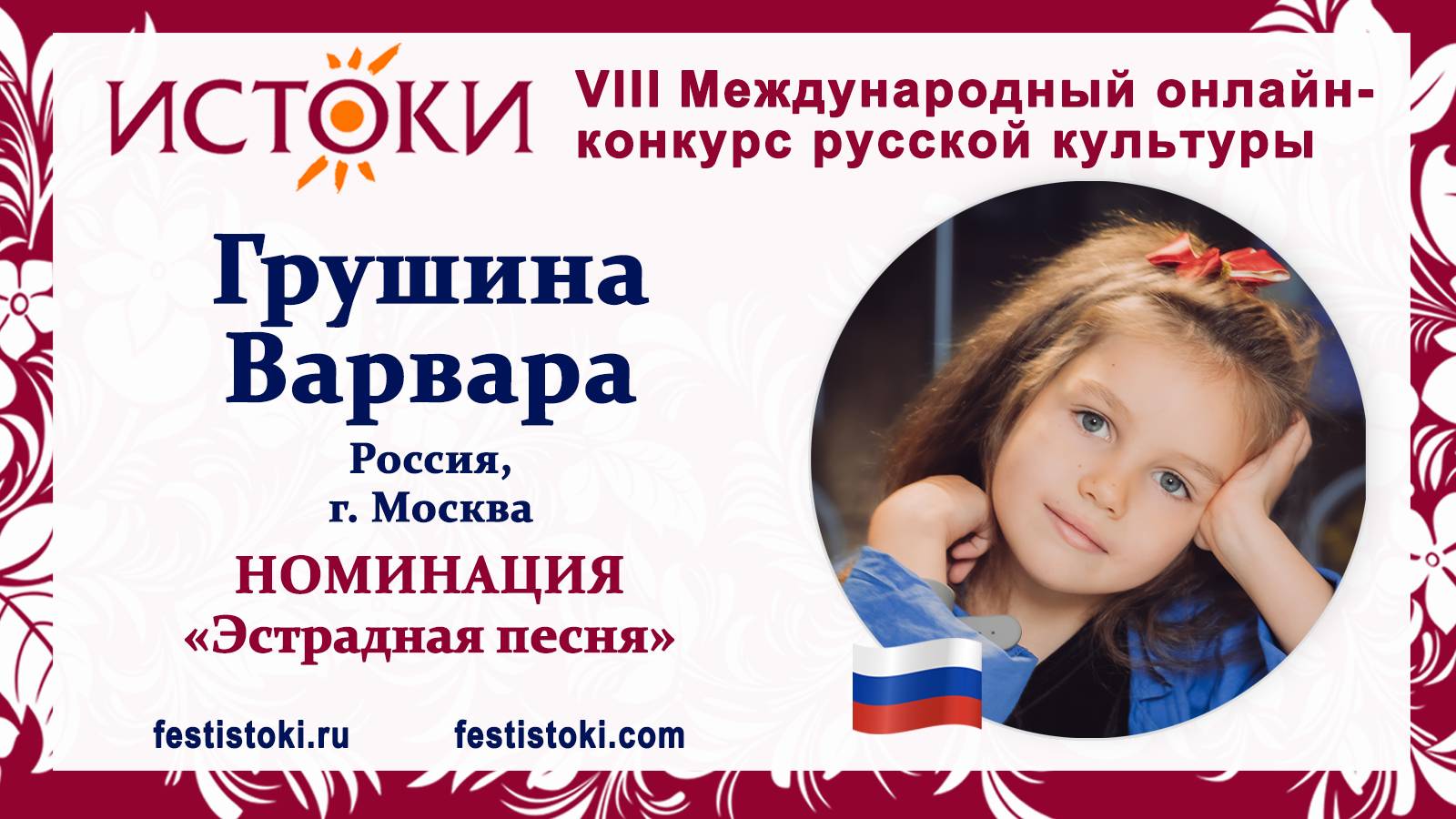 Участник VIII Международного онлайн-конкурса русской культуры "Истоки". Номинация "Эстрадная песня". Песня "Красная шапочка". Автор Екатерина Рябова. Сайт: festistoki.ru / festistoki.com E-mail: festistoki@mail.ru