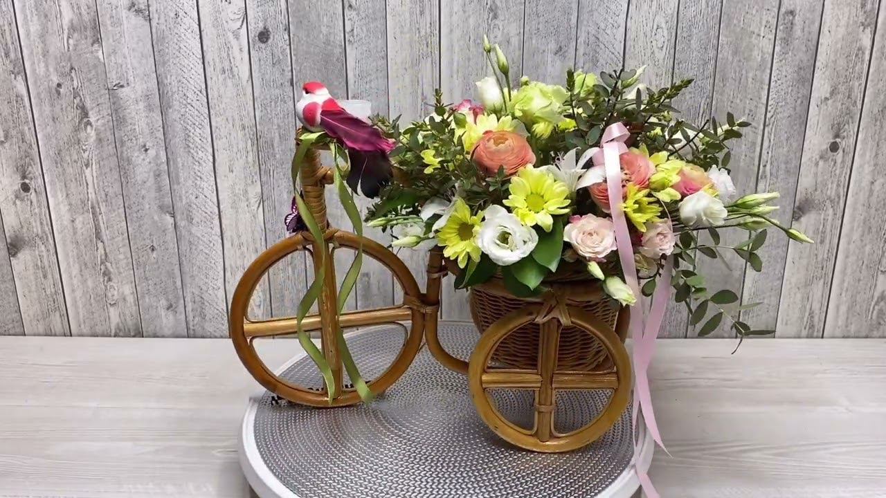 Композиция из живых цветов в кашпо велосипеде