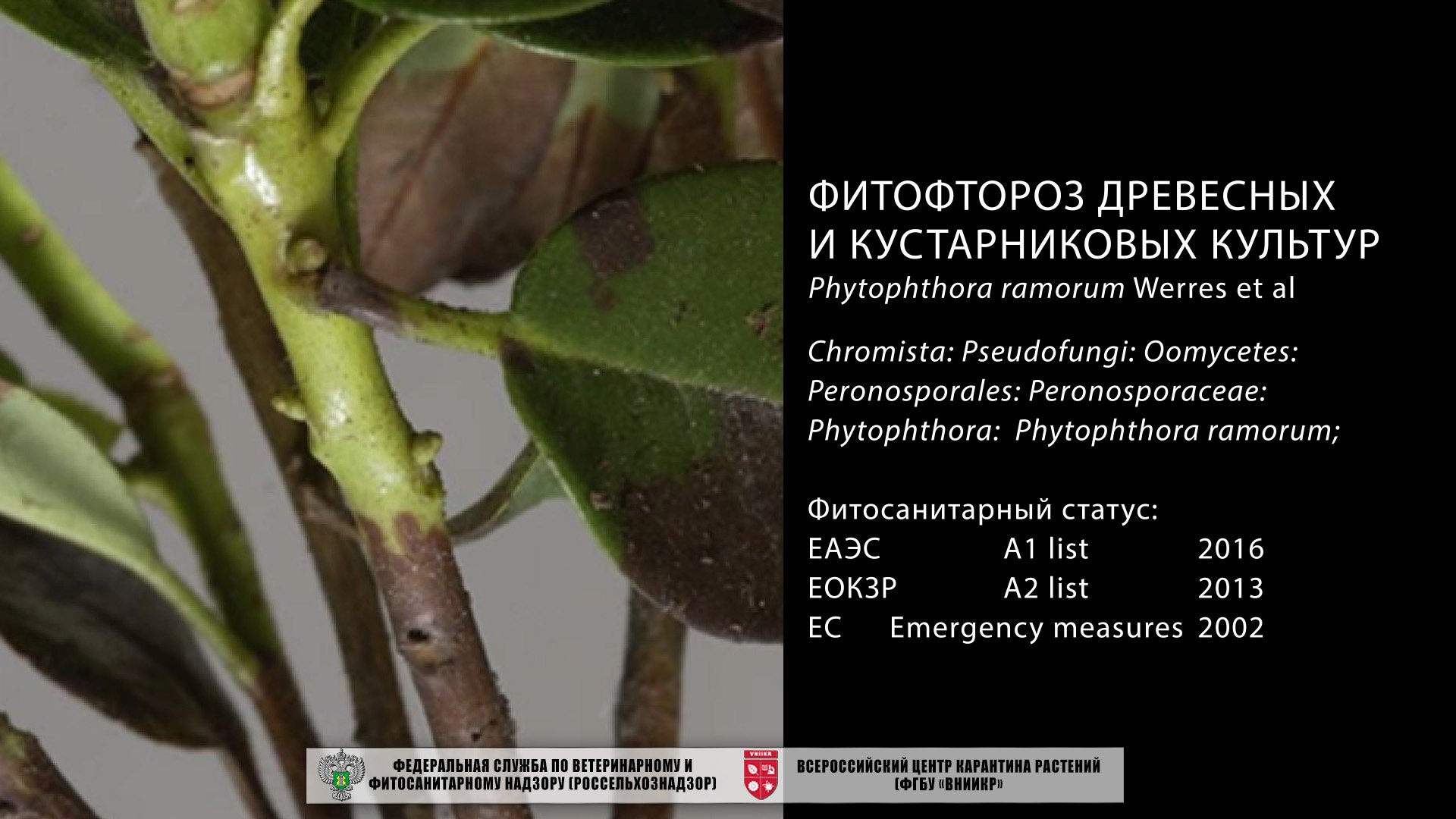Фитофтороз древесных и кустарниковых культур, Phytophthora ramorum (фитофтора раморум) - опаснейший возбудитель болезни растений. В Северной Америке патоген поражает 140 видов лиственных, хвойных деревьев, кустарников и других растений из 40 семейств. Среди них – дуб, клен, каштан, рододендрон, шиповник, камелия, калина, сирень, черника.
