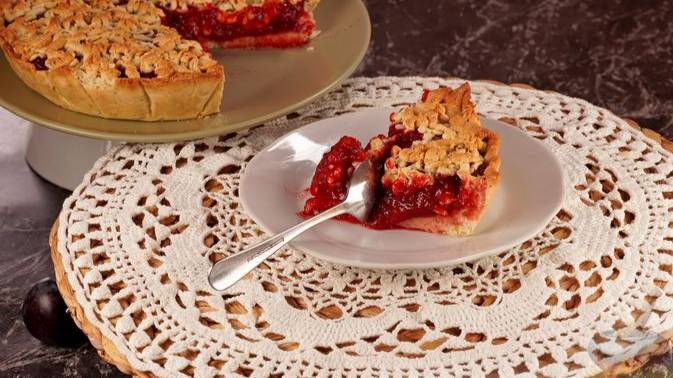 Пирог из песочного теста на молоке и яйцах. Тесто замешивается без масла, с добавлением измельчённого миндаля. В качестве начинки используется густой кисель, приготовленный из слив, сахара и крахмала. #НежирноеТесто #ПесочноеТесто #ПирогСоСливой #СладкийПирог